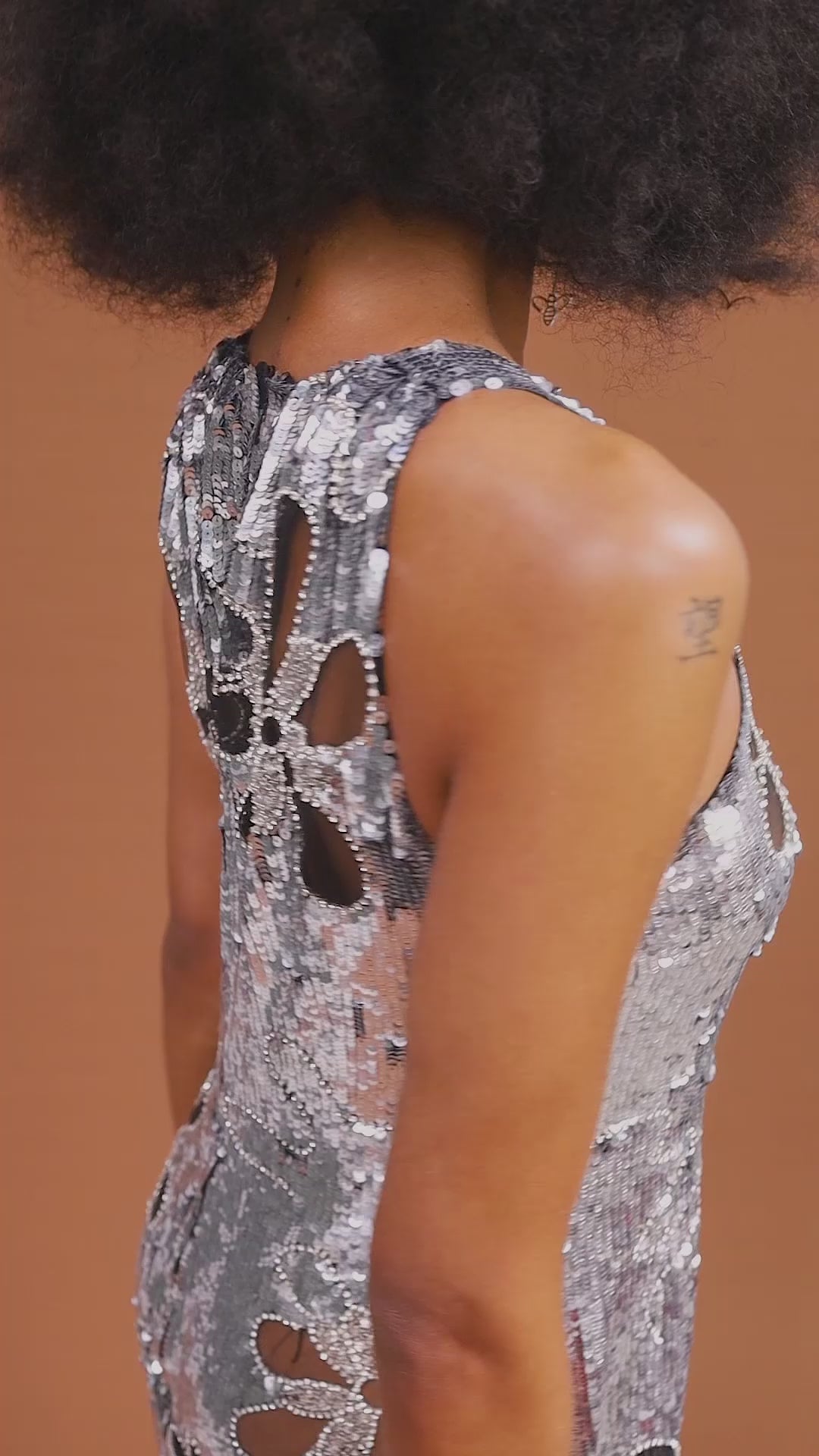The Hali Dress, a show-stopping maxi that redefines disco-inspired glamour with modern sophistication. Sparkling silver sequins and intricate beading form floral cutout designs, layered over delicate net fabric for a striking interplay of texture and transparency. This refined yet daring silhouette combines sheer elegance with bold artistry, making it perfect for unforgettable nights and statement-making moments.
