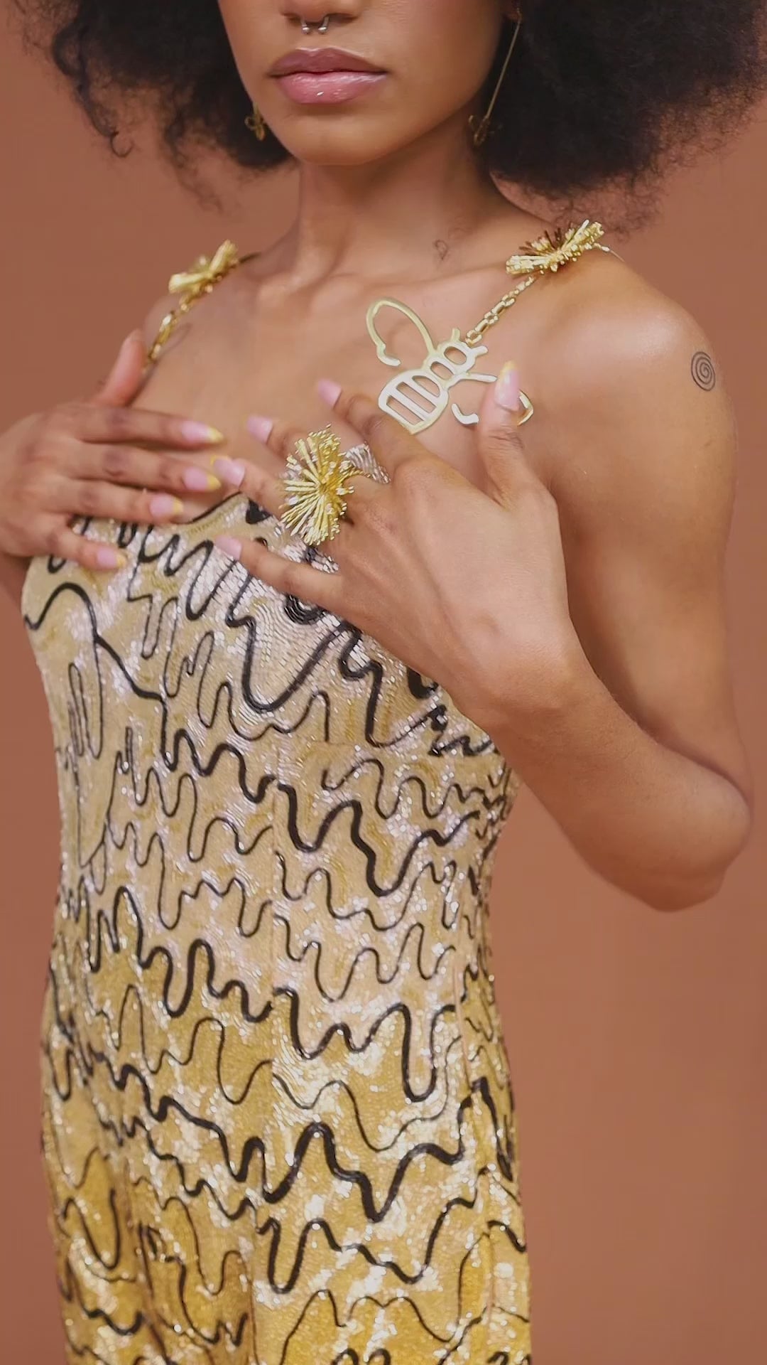 A dazzling 70s-inspired design that embodies luxury and creativity. Fully adorned with hand-beaded details shaped like dripping honey, this striking gold mini dress exudes opulence and charm. The 18ct gold hardware straps feature the signature Onalaja bee logo and Zora emblem, adding a refined touch to the captivating design. Perfect for disco-inspired nights or glamorous events, the Honey Mini Dress is a bold statement piece that blends artistry with retro flair.