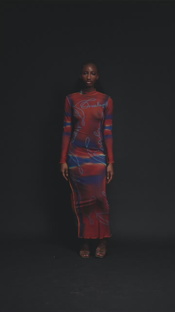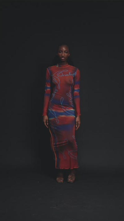 A bold signature moment. This curve-contouring mesh dress features a striking ombre effect, the Onalaja script logo throughout and raw edge detailing for a modern finish. Lightweight and effortless, it transitions from day to night with ease.