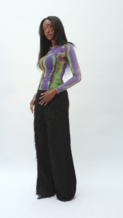 Elevate your look with the ONALAJA long-sleeve mesh top, featuring a round neck and a stunning gradient print that shifts at the waist to highlight your silhouette. Finished with the ONALAJA logo, this piece blends modern elegance with subtle, eye-catching style.