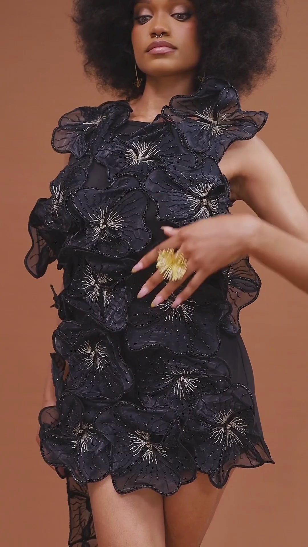 The Zene Dress, a captivating black mini dress that embodies girly romance through its intricate design and feminine details. Adorned with meticulously hand-applied 3D floral embellishments, each flower adds depth and texture, creating a whimsical yet elegant aesthetic. The flattering silhouette and delicate craftsmanship make the Zene Dress a refined addition to any wardrobe, perfect for those seeking a blend of sophistication and romantic charm.