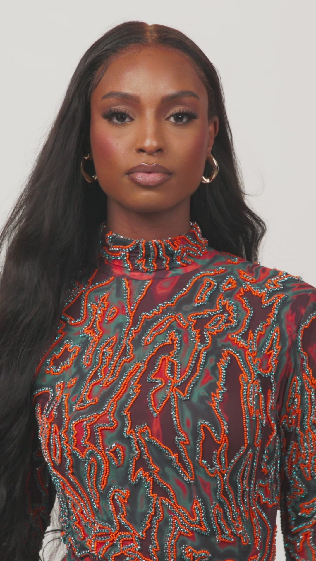 - All-Over Hand-Beaded Crystals: Luxurious detailing that creates a shimmering, eye-catching effect.