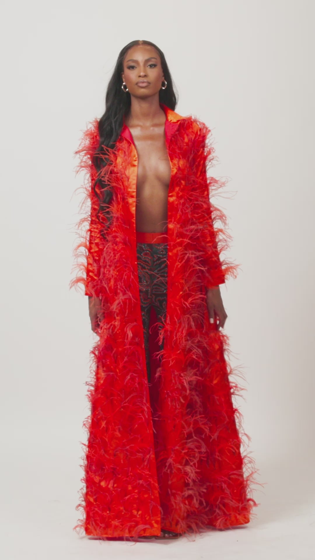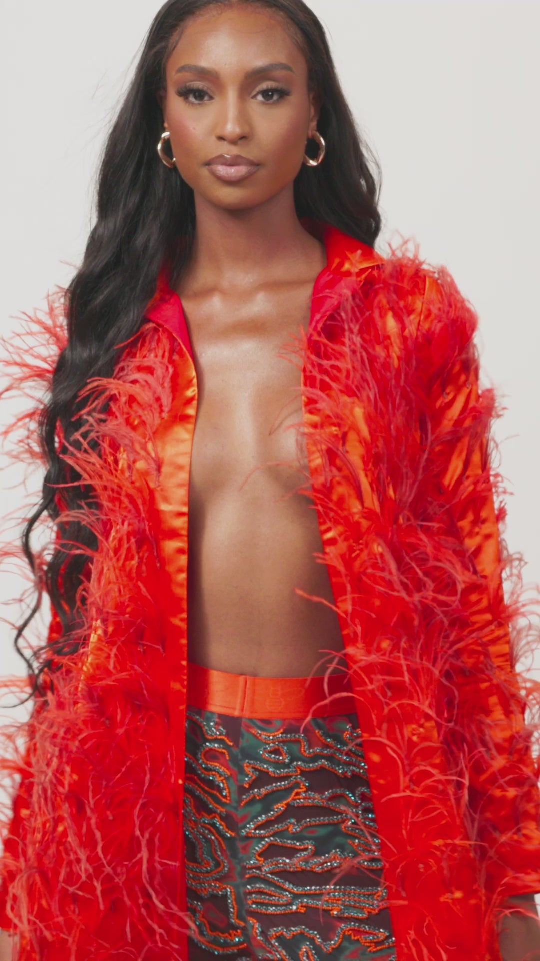 La chemise longue Draie Feather est une pièce à couper le souffle qui allie un design audacieux à un savoir-faire luxueux. Ce manteau long façon chemise est orné de plumes d'autruche orange vif, évoquant des flammes incandescentes, pour un look spectaculaire et inoubliable.