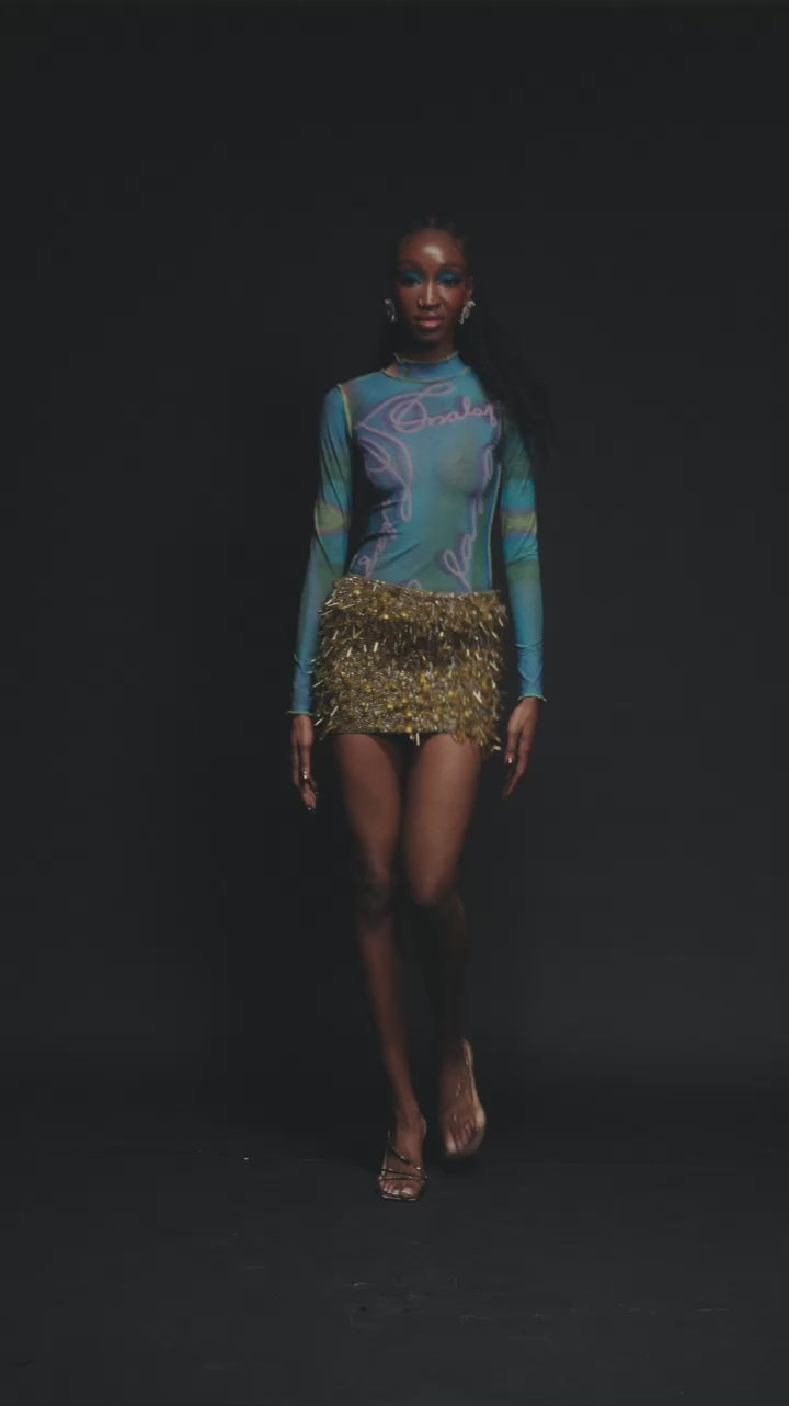 Une réinterprétation audacieuse de la robe signature d'Onalaja dans un imprimé multicolore. Ornée d'un motif camouflage abstrait aux allures de flammes, cette robe colorée est confectionnée en maille extensible et ornée de détails perlés à la main. Parfaite pour affirmer votre style, son motif vibrant et dynamique transforme cette silhouette intemporelle en un mélange saisissant d'élégance et de modernité. Un incontournable pour la « It Girl » qui souhaite se démarquer avec assurance et style.