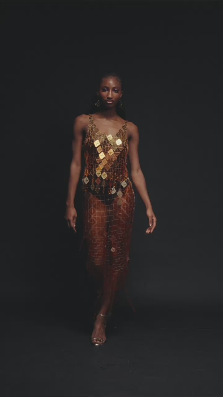 Une réinterprétation audacieuse de la robe signature d'Onalaja dans un imprimé multicolore. Ornée d'un motif camouflage abstrait aux allures de flammes, cette robe colorée est confectionnée en maille extensible et ornée de détails perlés à la main. Parfaite pour affirmer votre style, son motif vibrant et dynamique transforme cette silhouette intemporelle en un mélange saisissant d'élégance et de modernité. Un incontournable pour la « It Girl » qui souhaite se démarquer avec assurance et style.