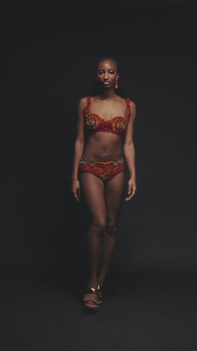 Une réinterprétation audacieuse de la robe signature d'Onalaja dans un imprimé multicolore. Ornée d'un motif camouflage abstrait aux allures de flammes, cette robe colorée est confectionnée en maille extensible et ornée de détails perlés à la main. Parfaite pour affirmer votre style, son motif vibrant et dynamique transforme cette silhouette intemporelle en un mélange saisissant d'élégance et de modernité. Un incontournable pour la « It Girl » qui souhaite se démarquer avec assurance et style.