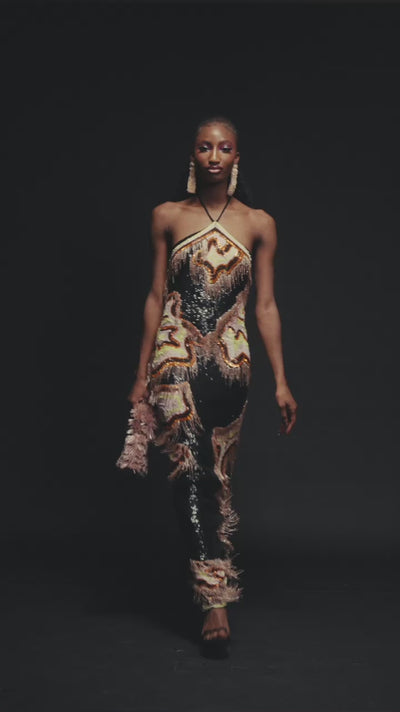 Une réinterprétation audacieuse de la robe signature d'Onalaja dans un imprimé multicolore. Ornée d'un motif camouflage abstrait aux allures de flammes, cette robe colorée est confectionnée en maille extensible et ornée de détails perlés à la main. Parfaite pour affirmer votre style, son motif vibrant et dynamique transforme cette silhouette intemporelle en un mélange saisissant d'élégance et de modernité. Un incontournable pour la « It Girl » qui souhaite se démarquer avec assurance et style.