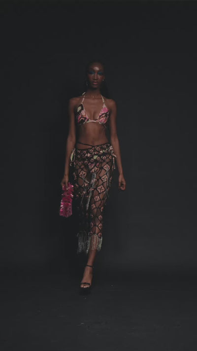 Une réinterprétation audacieuse de la robe signature d'Onalaja dans un imprimé multicolore. Ornée d'un motif camouflage abstrait aux allures de flammes, cette robe colorée est confectionnée en maille extensible et ornée de détails perlés à la main. Parfaite pour affirmer votre style, son motif vibrant et dynamique transforme cette silhouette intemporelle en un mélange saisissant d'élégance et de modernité. Un incontournable pour la « It Girl » qui souhaite se démarquer avec assurance et style.