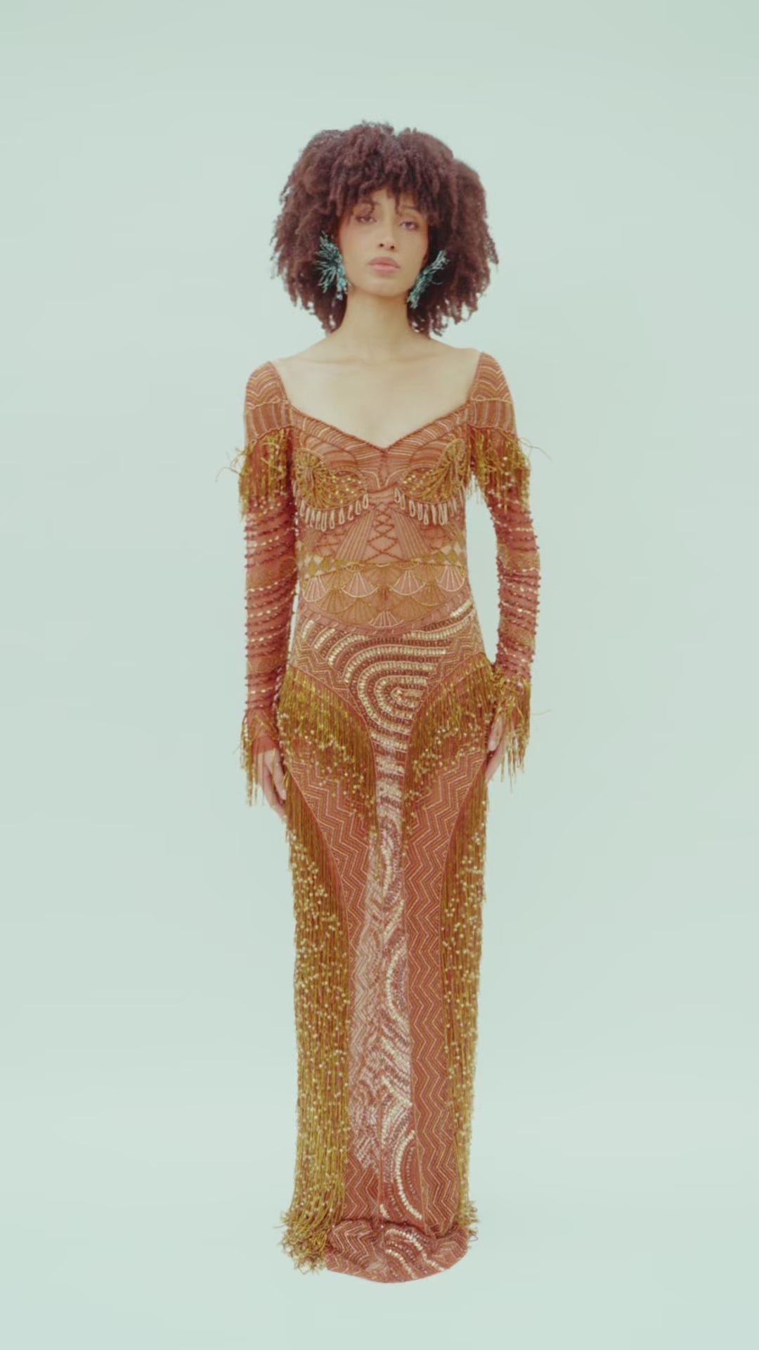 Elevate your evening with this exquisite handmade beaded gown. Featuring meticulous beadwork throughout, the dress captures light with every movement. Golden tassels cascade along the legs, adding shimmer, texture, and playful motion. Designed to flatter the silhouette, it perfectly balances elegance and bold artistry, making it a show-stopping statement for any special occasion. Each bead is purposefully placed to follow the body’s contours, illuminating the form with precision and grace.