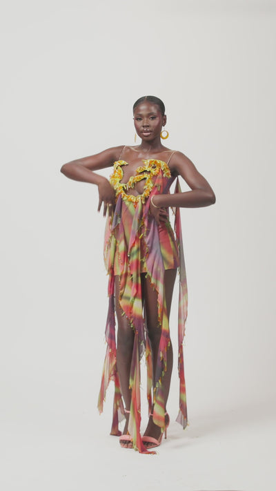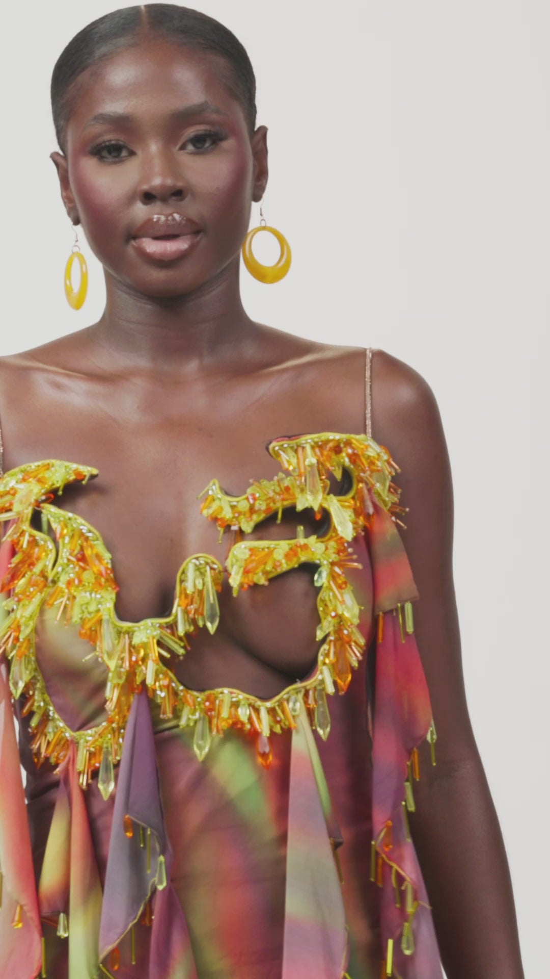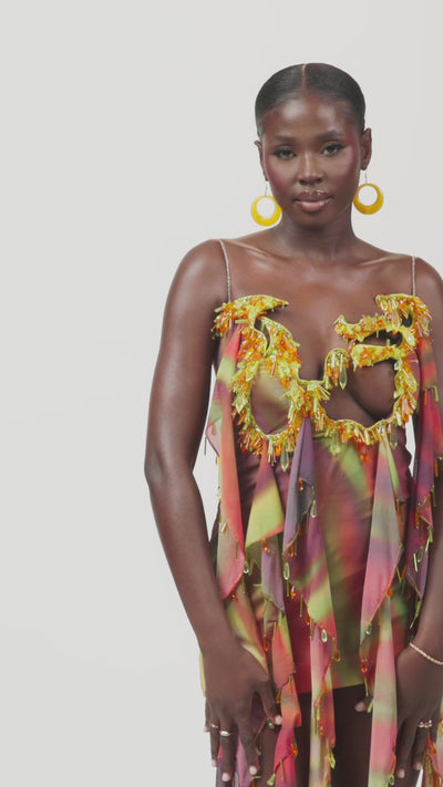 Hand beaded fire bodice cutout dress, with layered all over ruffles