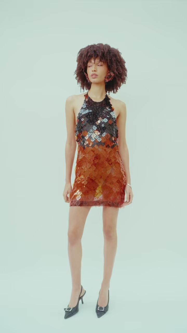 This halter neck mini dress is made from individually laser-cut pieces and carefully sewn together to form a seamless gradient from deep black to vivid orange and soft peach at the hem. The intricate construction of colours that make ombre give a deeper effect of depth and fluidity.