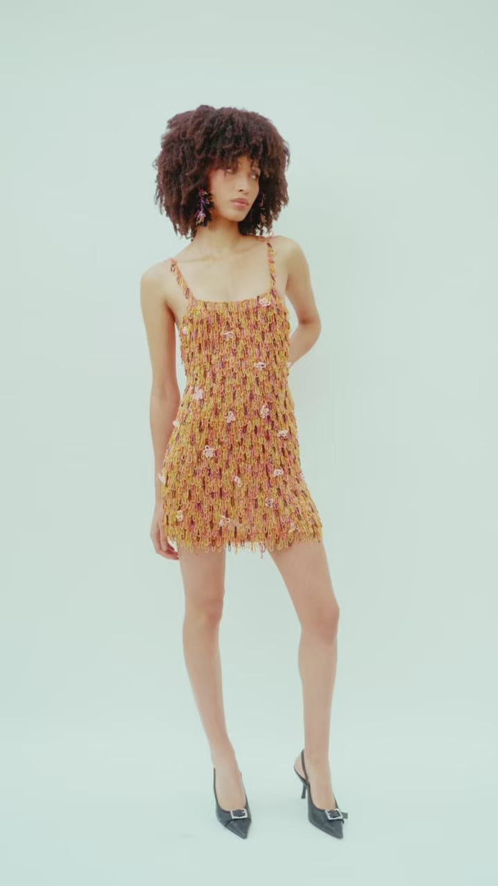 Turn heads with this statement mini dress, adorned with layers of circular fringes made from orange, red, and black beads that sway with every movement. Delicate baby pink beaded flowers bloom across the surface, adding a touch of sweetness to its bold, rhythmic design.