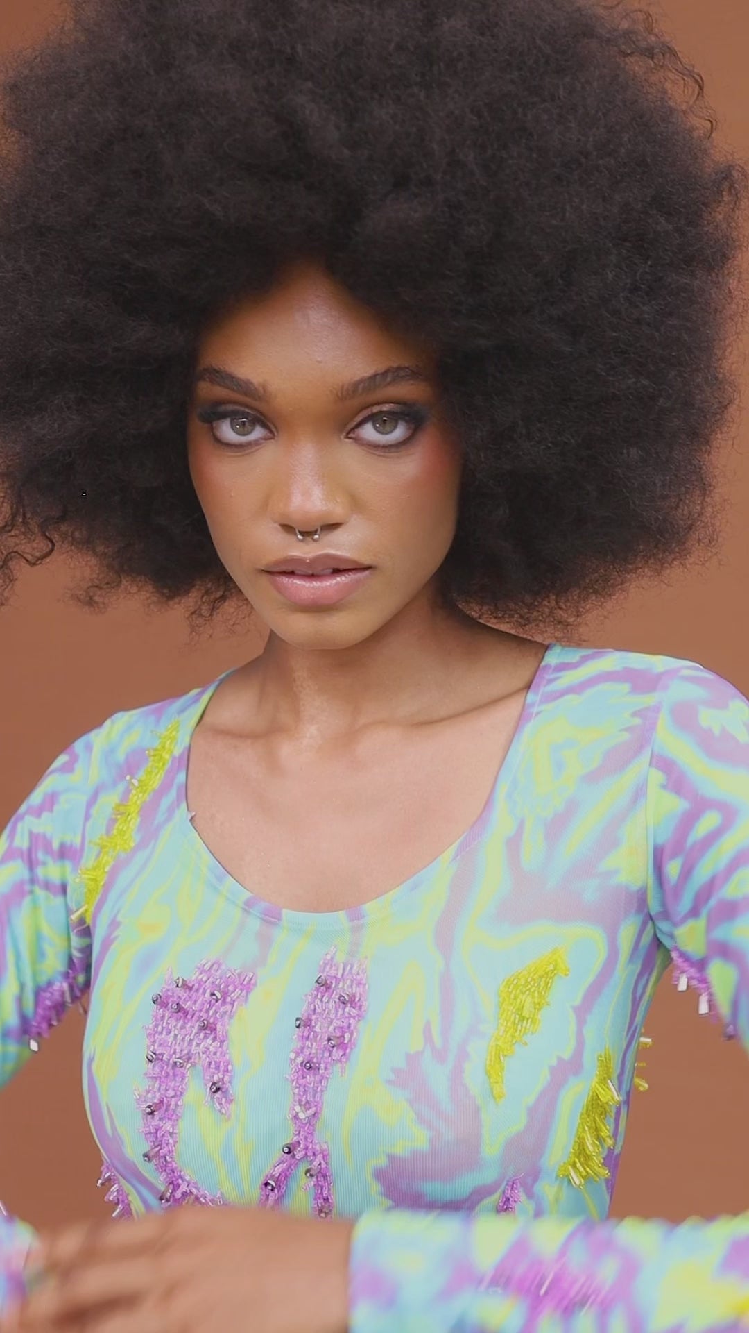 A bold reimagining of Onalaja’s signature dress in a multi-print design. Featuring an abstract, flame-like camouflage design, this colourful dress is crafted from stretch mesh and adorned with intricate hand-beaded detailing throughout. Perfect for making a statement, the vibrant and dynamic pattern transforms this timeless silhouette into a striking blend of elegance and modern edge. A must-have for the “It Girl” looking to stand out with confidence and style.