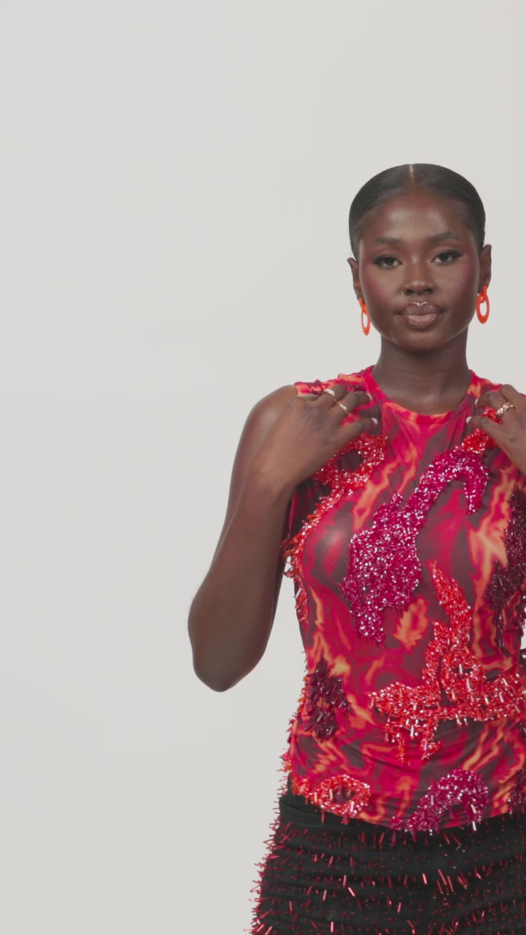 A bold reimagining of Onalaja’s signature top in a multi-print design. Featuring an abstract, flame-like camouflage design, this colourful top is crafted from stretch mesh and adorned with intricate hand-beaded detailing throughout. A must-have for the “It Girl” looking to stand out with confidence and style.